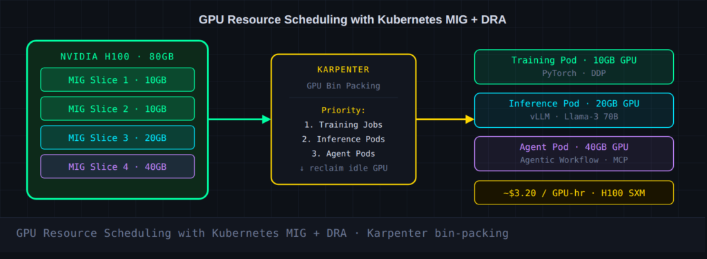 MIG (Multi-Instance GPU) — partitions a single GPU into isolated, right-sized slices.DRA (Dynamic Resource Allocation) — moves beyond static device plugins to allow runtime GPU partitioning and reassignment between pods.Karpenter — provisions the exact node types needed and aggressively deprovisions idle capacity, keeping GPU bills from spiraling.SOCI (Seekable OCI) — accelerates startup times for large model-serving containers, slashing the cold-start penalty that was killing autoscaling efficiency.